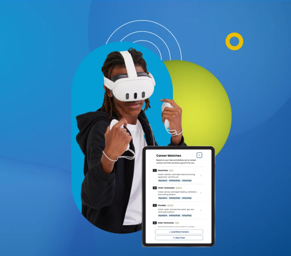 Transfr Trek is a multimodal career exploration program that helps learners discover career interests, explore more than 150 high-demand occupations, and experience “day-in-the-life” simulations through short, engaging VR experiences.